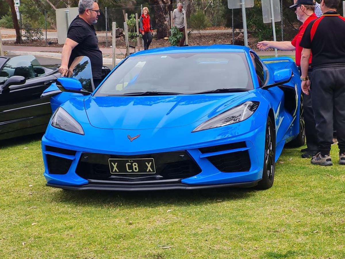 Picnic tables and umbrellas had been set up for us near our vehicles, under the shade of gumtrees for an enjoyable lunch and afternoon. Everyone grabbed a drink and staff came to our tables to take lunch orders. In the meantime, Fred the hotel owner had taken a real liking to a blue C8, so Ricky the owner was kind enough to take Fred for a drive, you couldn’t wipe the smile from his face, as it was his first time in a vette, and what a vette it is, thank you very much Ricky. I hear Fred has been scrolling the classifieds looking for a new “company” vehicle. Lunch arrived and was enjoyed by all, perfect weather and great company for a Sunday afternoon picnic amongst Corvettes overlooking Thorndon Park.